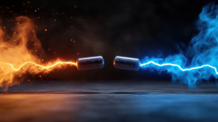 3D render of fire and ice clash with electric sparks, dramatic concept of opposing forces on a black background
