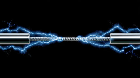 A stunning depiction of electric energy sparking between two wires, showcasing a bright blue light against a dark backdrop, perfect for illustrating power concepts.