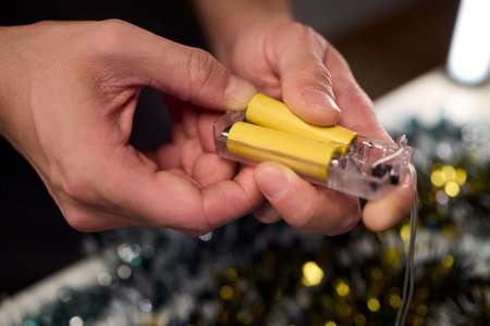 Technician assembling festive light string, Close view of hands installing holiday lighting, Focus on technician connecting string lights during festive preparations