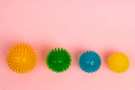 colored massage needle balls of different sizes on a pink background, the concept of prevention of flat feet, hallux valgus