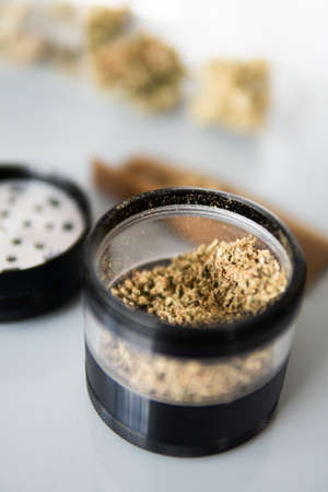 Close up of marijuana blunt with grinder. Rolling a marijuana joint.