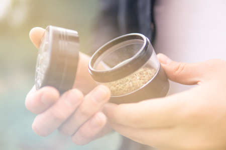 Kief in grinder Close up vertical shot. The pot leaves on buds THC CBD. Indica Sativa medical health. White background. Grinder and cannabis weed bud. Marijuana nature bud. Light leaks toned