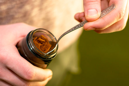 a man takes ground coffee with a spoon from a coffee grinder. High quality photo
