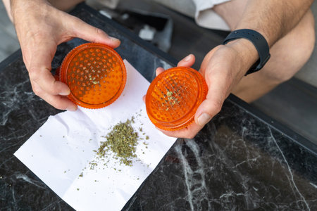 Close-up of a middle aged mans hands using an orange plastic grinder to shred cannabis buds onto a piece of folded white paper, set on a black marble tabletop.