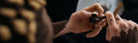 Cropped view of african american man with vitiligo holding lighter and cigar in bathtub, banner