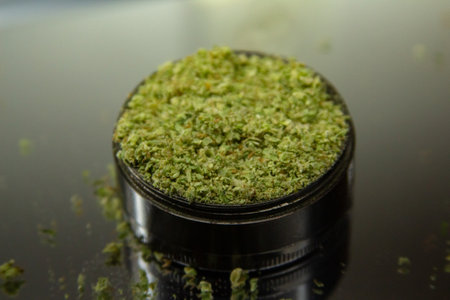 close up, marijuana buds on black table, grinder in hand with fresh Cannabis, weed for joint, light leaks color tones