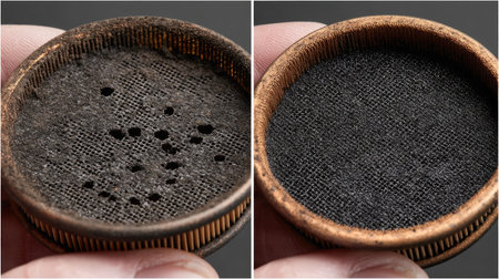 This image features a close-up comparison of two filter screens, one with visible damage and dirt, and the other freshly cleaned. The intricate details highlight texture differences, showcasing wear and cleanliness.