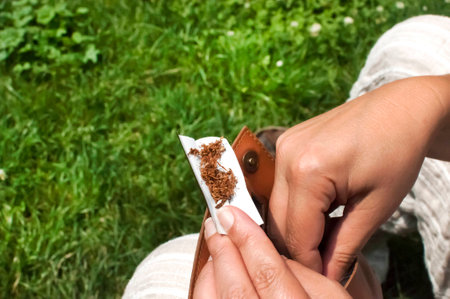 Female hands that put tobacco on cigarette paper