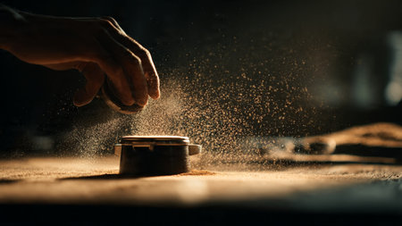 Close up shot of a person sifting flour on a table.