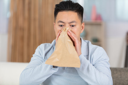 Adult man uses nasal stick inhaler to smell for relieve dizzy and faint symptoms. Concept health problem, sickness and remedy. Increases freshness, reduces dizziness and stuffy nose. self take care.