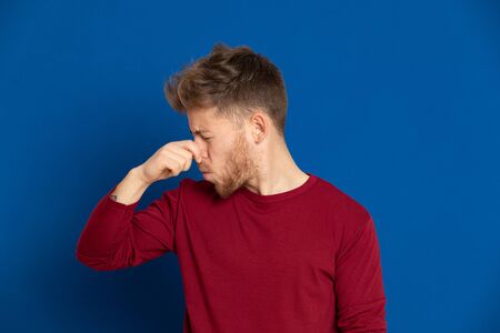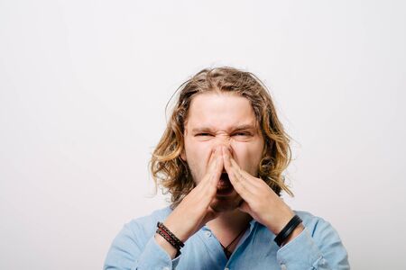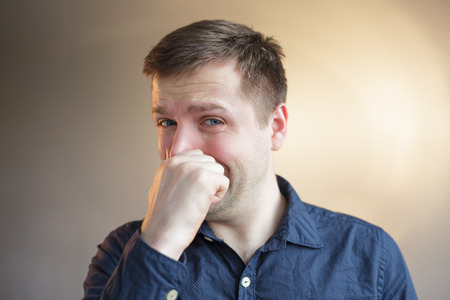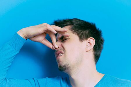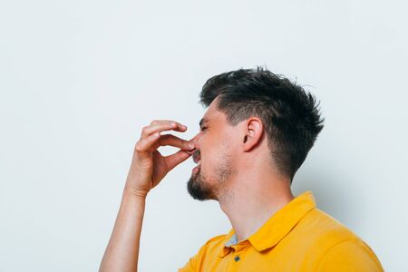 Confused unhappy man grabbing nose with fingers and stretching hand out feeling disgusted, A man with covering his nose