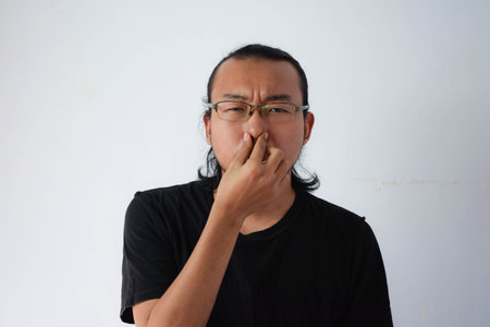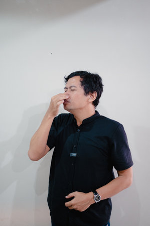 A man grimaces, pinching his nose as if repulsed by a foul smell. This studio shot focuses on his facial expression and gesture, highlighting his immediate reaction to an offensive odor in the air