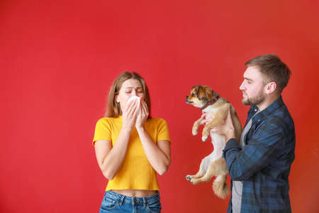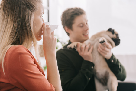 Selective focus of sneezing woman allergic to dog looking at happy man with pug