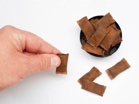 snus. soft focus. the man's hand is in it, tobacco in bags. the background is wooden in a retro style. there is a tinting. close-up