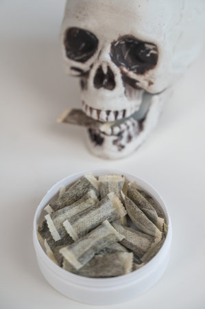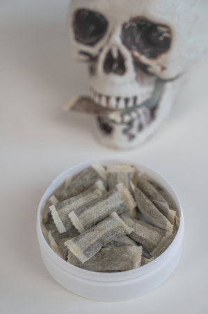 Snus pads, nicotine spiders on a paper background, the concept of a bad habit.