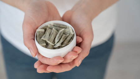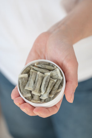 Woman's hand takes Swedish snus from a box, close-up