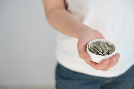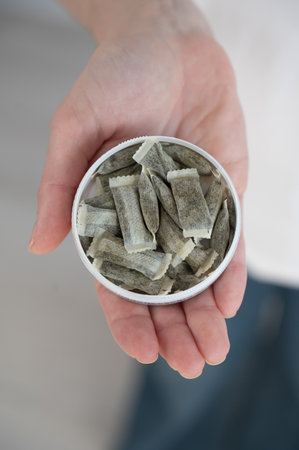Sachets of Swedish snus in a man's hand on a black background