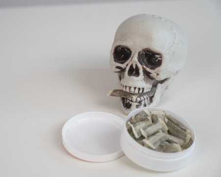 Skull Chewing Tobacco on a White Table