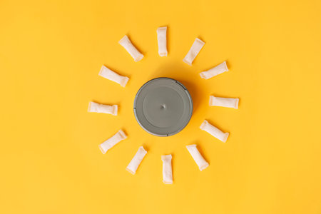 White thin snus sachets are laid out around a round jar on a yellow background