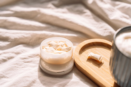 A jar of snus next to coffee for breakfast and flowers.