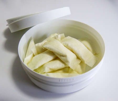 Dishwashing cloths in a plastic container on a white background.