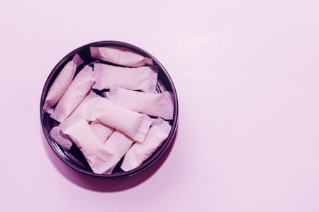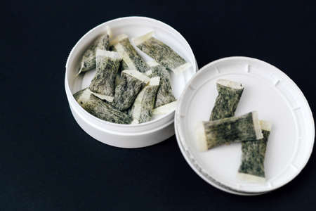 opened container with snus nicotine white bags on a dark background. copy space for design