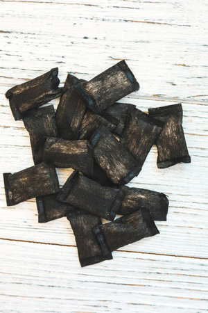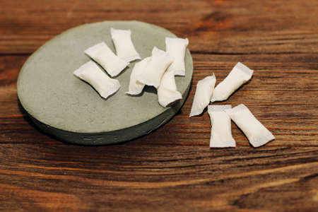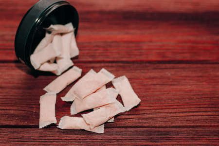 snus. tobacco in bags. the background is wooden in a retro style. there is a tinting. close-up