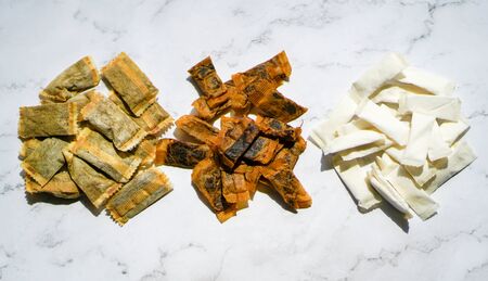Three different types of Swedish snus chewing tobacco on a white granite background