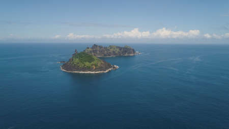 Small rocky islands in the sea, blue sky and clouds. Dos Hermanas, Palau, Santa Ana. Aerial view of seascape with tropical islands in the ocean.