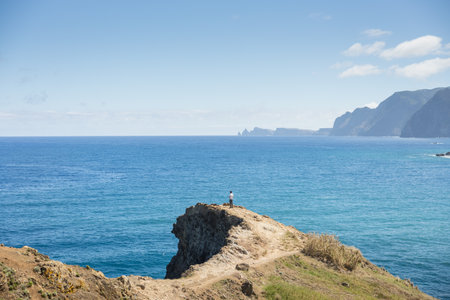 View of Madeira scenic cliffs coastline landscape from Guindaste viewpoint. Madeira island, Portugal