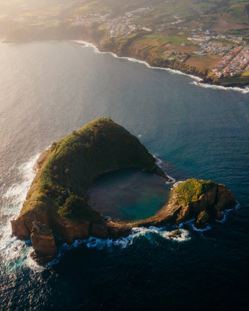 A bird's-eye view of the Islet of Vila Franca do Campo, Azores, Portugal, showcasing the lush greenery, the circular crater lagoon, and the surrounding deep blue waters of the Atlantic Ocean.