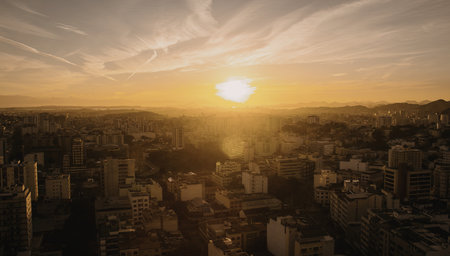 A panoramic view of a city during sunset, with the sun low on the horizon casting a golden glow over the buildings.