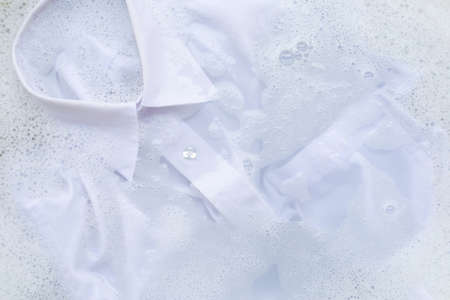 Top view of clothes soak in powder detergent water dissolution. Laundry concept