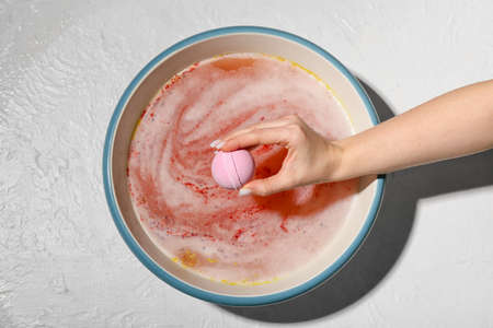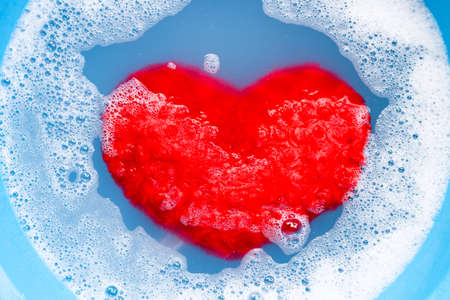 Soaking heart red pillow in laundry detergent water dissolution before washing. Laundry concept, Top view