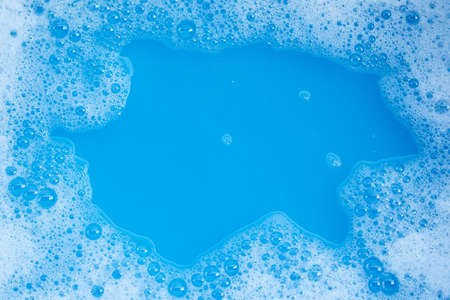 Soap foam against the turquoise background. Bubbles of washing foam and white dots on the colored surface. Shampoo foam texture. selective focus.