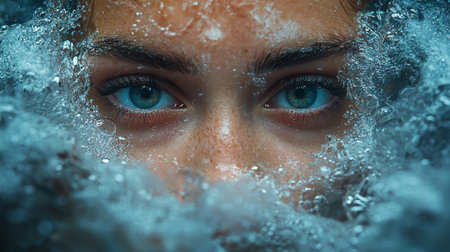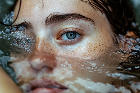 Close-up shot of woman's face in water. Portrait of woman with blue eyes looking out from water