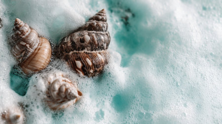 A beautiful close-up of various seashells nestled in frothy white foam against a backdrop of soft blue water, showcasing nature's artistry.