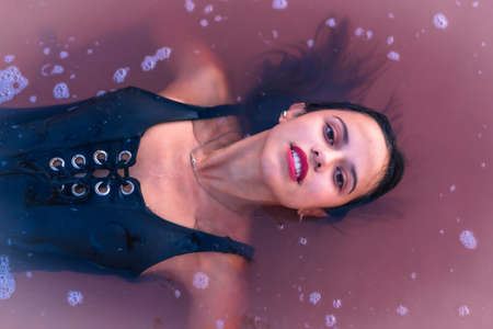 Posing of a young brunette Caucasian on vacation in summer in the pink lagoon of Torrevieja, lying in the water looking at camera, Alicante. Spain