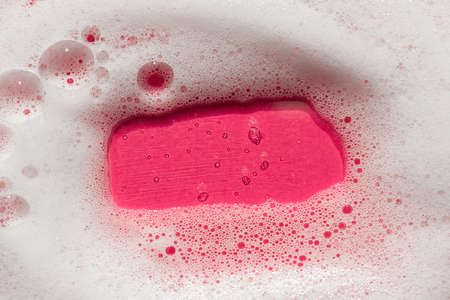 Foam on a pink background. Soapy liquid texture with bubbles. Natural sunshine and shadows. Skincare cleansing cosmetic in top view.