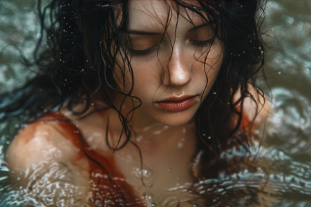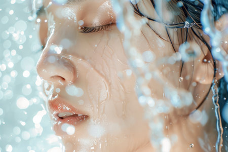 A vibrant portrait capturing shimmering droplets on damp skin, kinetic water spray, and tousled hair conveying freshness and dynamic energy.