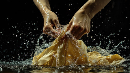 A dramatic view of water splashing as hands twist a drenched cloth, set against a dark background