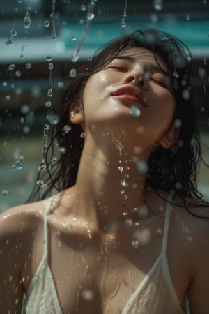 A woman is standing under a shower head with water pouring over her face. The water droplets are creating a blurry effect around her face, making her look like she is in a dream