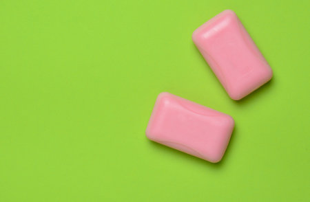 Two pink pieces of soap on a green background. Minimalist trend, top view, copy space.