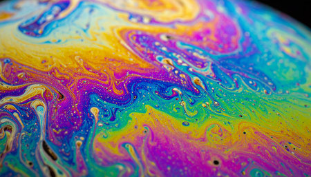 A mesmerizing macro view captures the chaotic yet beautiful dance of iridescent colors across the delicate surface of a soap bubble.