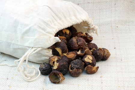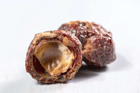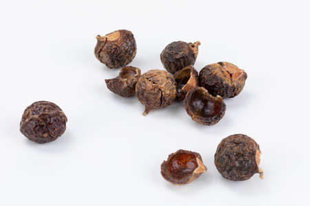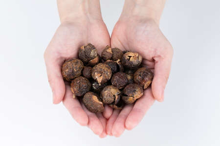 Brown dry soap nuts (Soapberries, Sapindus Mukorossi) for organic laundry and gentle natural skin care on light background.