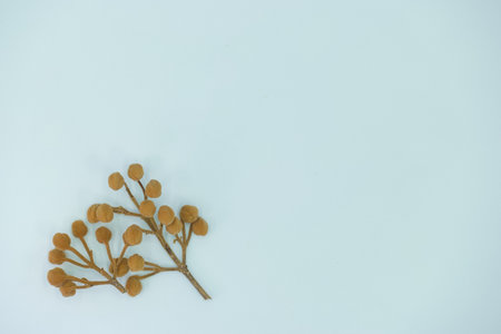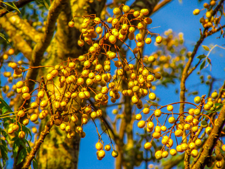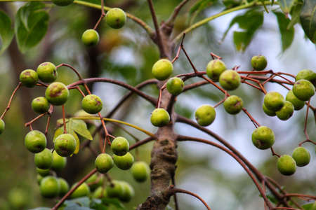 Close-up of the branch with fruits of the Melia tree (Melia azedarach), with sunny background of the image out of focus