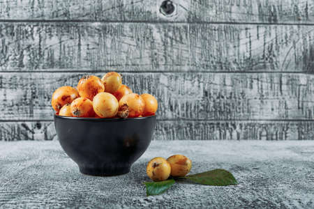 Top view loquats in bowl with leaves on gray textured background. horizontal space for text