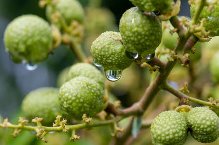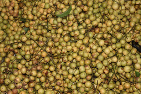 Longan ripe fruits (Dimocarpus longan) with water drops, in shallow focus