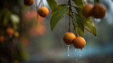 Soft rain falling gently on Bael fruit, with water droplets forming and slowly dripping. The background is softly blurred with a natural, moody atmosphere.