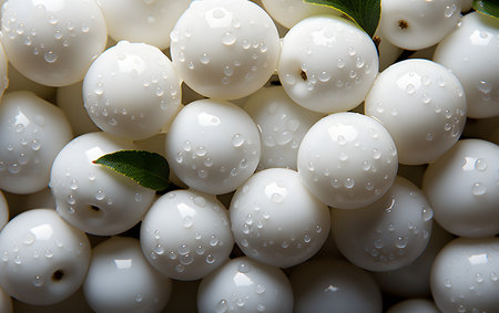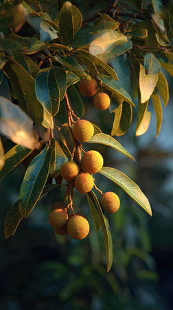 Indulge in the verdant paradise of this vibrant image, where a luscious cluster of lychee fruits hangs from a tree branch, bathed in the warm glow of an evening sun The lush green leaves provide a soft, ethereal backdrop, while bokeh lights dance in the distance, adding a touch of whimsy and enchantment This photograph captures the essence of nature's bounty, inviting us to savor the sweet taste of summer and the beauty of the natural world AI Generative